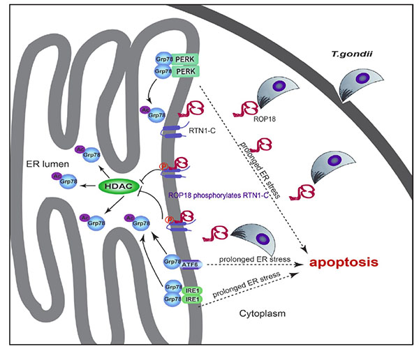该课题组研究发现弓形虫的一个关键毒力因子ROP18具有激酶活性,通过磷酸化宿主中枢神经系统高表达蛋白RTN1-C,导致组蛋白去乙酰化酶(HDAC)的活性下降,诱导了内质网伴侣蛋白GRP78的高度乙酰化,致使内质网应激通路过度活化,进而诱导宿主神经细胞发生凋亡。该研究发现了弓形虫经ROP18-RTN1-C-HDAC-GRP78信号通路引起TE的致病机制,揭示了上述机制是弓形虫感染导致神经系统损伤的重要原因之一,成果为弓形虫对宿主神经系统偏嗜的研究提供重要的线索,也为弓形虫感染所致神经系统疾病的防治提供新的思路。该成果的全部研究均是在本校实验平台上完成的。
