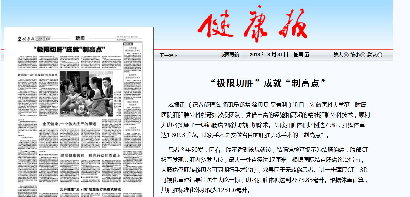 患者今年50岁,因右上腹不适到该院就诊,结肠镜检查提示为结肠腺癌,腹部CT检查发现其肝内多发占位,最大一处直径达17厘米。根据国际结直肠癌诊治指南,大肠癌仅肝转移患者可同期行手术治疗,效果同于无转移患者。进一步薄层CT、3D可视化重建结果让医生大吃一惊,患者肝脏体积达到2878.83毫升。根据体重计算,其肝脏标准化体积仅为1231.6毫升。