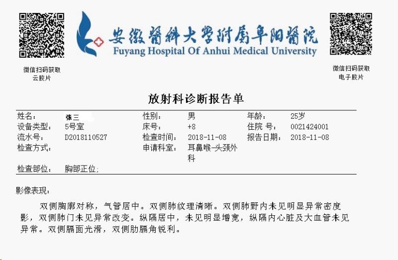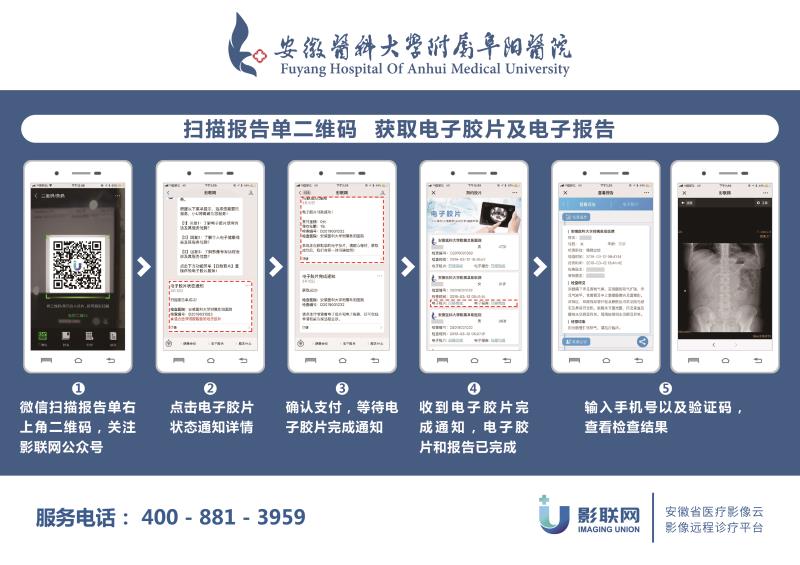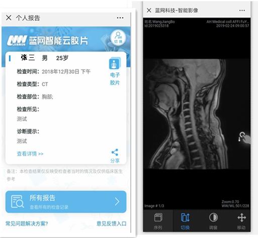 安医大附属阜阳医院此次开通的电子云胶片服务采用了两种方式,一种是在医院公众号上开发的电子胶片服务,病人在医院公众号上绑定个人信息后即可获取本人在本院的各项影像检查图像和报告;另一种是与安徽省医疗影像云平台对接提供的电子云胶片服务,病人可通过扫描预约单/报告单上二维码方式,获取影像和报告。如果病人有需要还可在线申请其他省级医院影像学专家对自己的检查图像进行远程会诊。该院影像中心医生通过平台,还可以对接入云平台的其他医院的有需求病人进行远程影像诊断,使病人不用到医院即可享受到省级公立三级综合大医院影像专家的优质诊断服务。