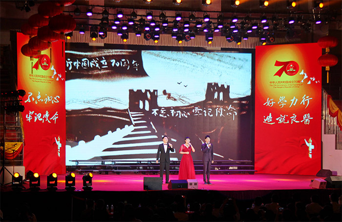 整场晚会共14个节目,高潮迭起,展示了我校师生丰富多彩的文艺生活和积极向上的精神风貌。老师和学生们用自己的实际行动向新中国70岁生日献上了最诚挚、最美好的祝福,表达了我校广大师生不忘初心、牢记使命,以永不懈怠的精神状态和一往无前的奋斗姿态,为早日建成高水平医科大学而努力奋斗的决心。(新闻中心)