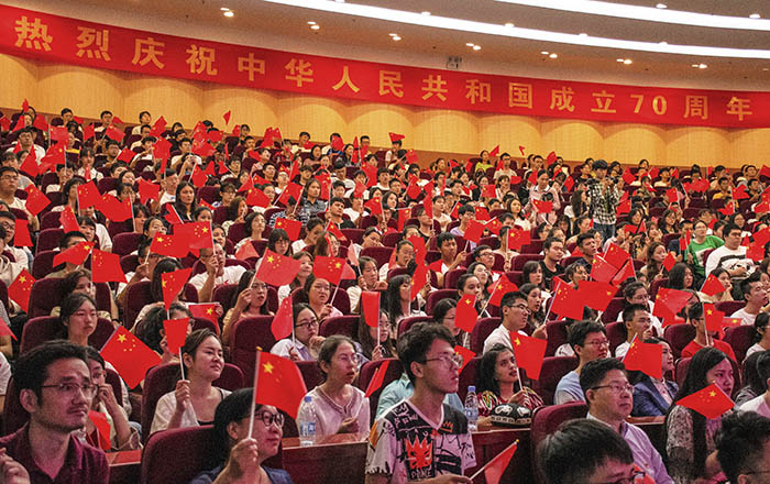 上午10时,当电视画面出现习近平等党和国家领导人登上天安门城楼时,伴着70响礼炮轰鸣,报告厅里响起了热烈掌声。当义勇军进行曲响起时,全体师生庄严肃立,共唱国歌,仿佛置身于盛典现场。当习近平总书记在讲话中高呼:“伟大的中华人民共和国万岁!伟大的中国共产党万岁!伟大的中国人民万岁!”现场沸腾了,雷鸣般的掌声经久不息。