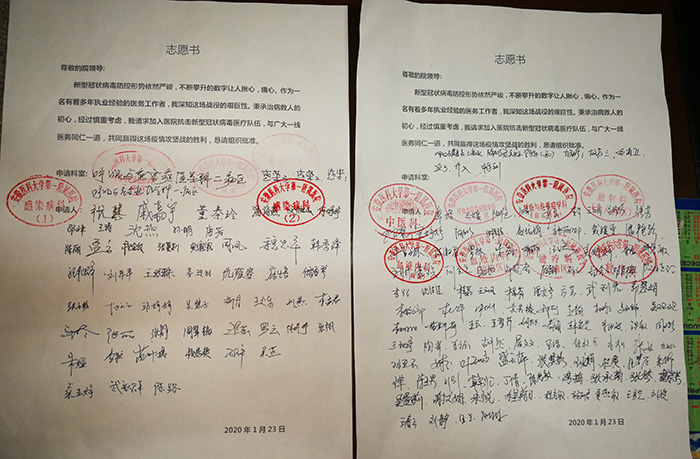 “我是中医科医师,我院作为省级后备定点诊疗医院,为打赢这场人民生命健康保卫战,紧急征调医护人员24小时待命。我院尚处于发展初期,医护人员严重不足,作为医院的一分子,我自愿报名,随时待命,加入医院各项诊疗活动。”附属阜阳医院宁屹在请愿书上写道。