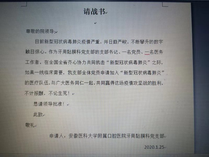 “如果一线临床需要,我们全体党员申请加入’新型冠状病毒肺炎’的医疗队伍,与广大医务同仁一起,共同赢得这场疫情攻坚战的胜利,不计报酬,不论生死!”这是该院牙周粘膜科支部书记、副教授、副主任医师张雷郑重向院党委递交的请战书,情真意切、感人至深。