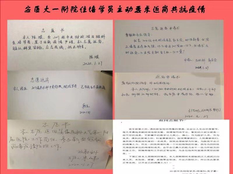 1月27日,一封封按着红手印、郑重签着姓名的《志愿返岗申请书》《请战书》纷至沓来,不断从各科室递送到我校一附院教育处处长田仰华的办公桌上。