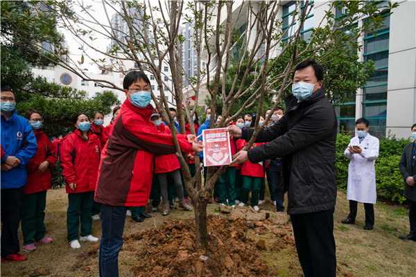 3月16日上午9点,安徽医疗队与华中科技大学同济医学院附属协和医院肿瘤中心,在该院肿瘤中心Z楼前的花圃,种下一株象征着“皖鄂情深”的友谊树。