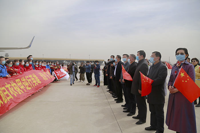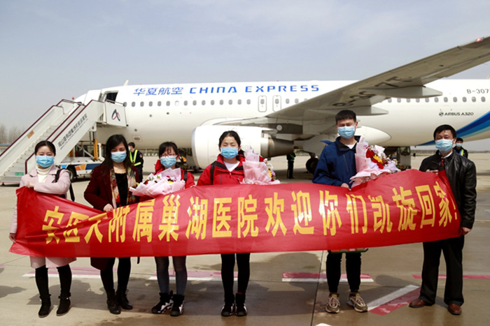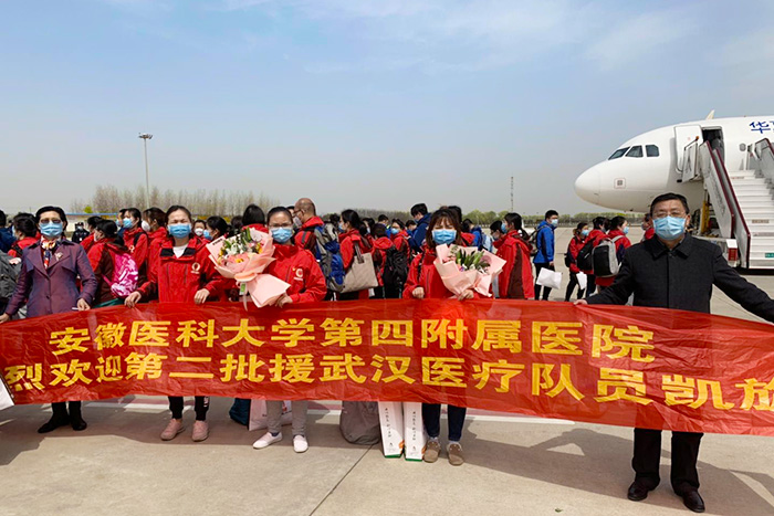3月19日上午,安徽省第二批、第八批支援湖北医疗队共130名队员圆满完成支援任务,搭乘专机平安返回合肥。我校各直属附属医院15名战“疫”英雄不畏艰险、不负重托,在圆满完成支援任务后,随队返回。省卫健委副主任杜昌智、崔礼军带队前往机场迎接英雄凯旋。我校各直属附属医院相关负责人在机场迎接队员回家。
