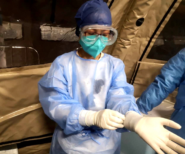 刚进方舱的我们,也和许多患者一样,有着很多不适应。从监测患者生命体征,为患者发药、送饭菜、水果牛奶、生活物品到直接接触患者采集咽拭子、抽血、带病人做CT检查等,我们就像一个陀螺一样,不吃不喝工作6—8个小时,几乎一刻都不能歇息。尤其是雨天,带病人去做CT检查时,虽然是短短的一段路,但是汗如雨下,厚厚的防护服里面是透湿的衣服,浓浓的水汽沾满了护目镜,几乎看不清路……但适应了一段时间之后,只要我一进舱穿上防护服,脑海里记得的只有全力做好患者的护理服务,心里想的只有和这些患者一同并肩作战,让他们早日康复,其他的一切都抛诸脑后。