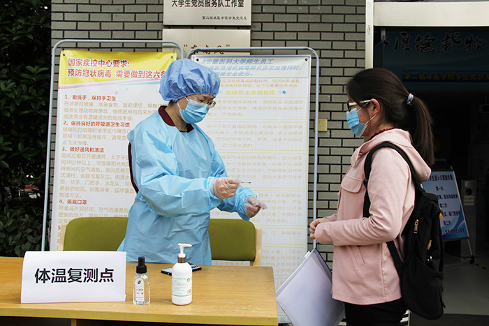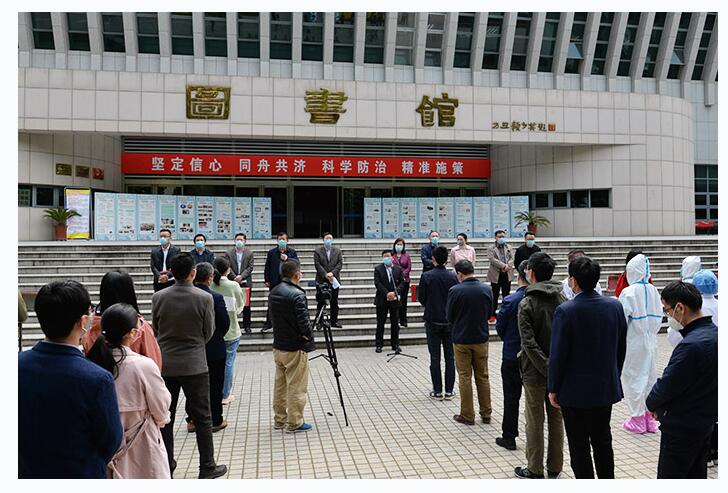 食堂就餐模块中,演练了学生按要求保持1米间距排队进入食堂,经体温检测及洗手消毒后前往售卖窗口处购餐,自带餐具打包餐食后按照规定路线离开餐厅等具体内容。图书馆学习模块对学生如何进入图书馆、借阅室内自助借还书以及图书消毒情况作了演练和介绍。相关职能部门负责人还对学生返校后食堂及图书馆现场相关设置和安排情况作了详细说明。
