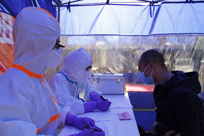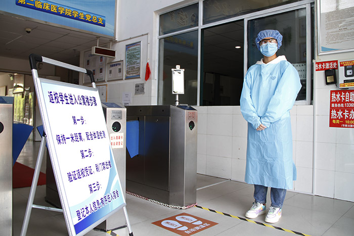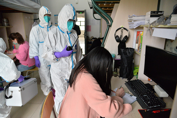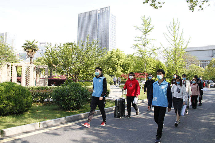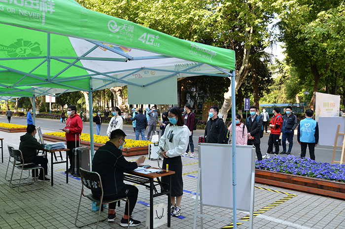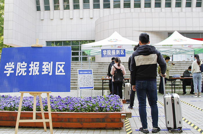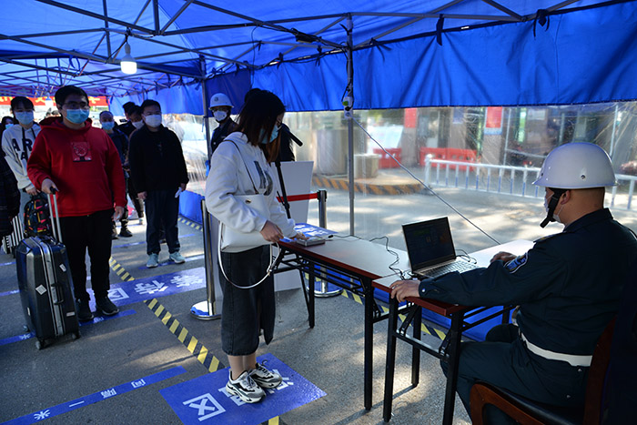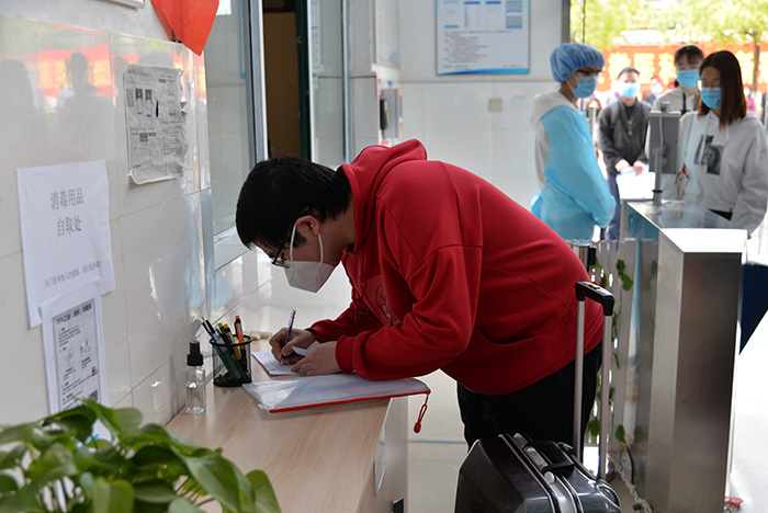 演练现场,学生入校时按照地贴位置间隔1米排队等候,出示身份证件,刷一卡通入校。体温检测无异常者,完成入校消毒程序,领取学校发放的入校物资包,更换口罩后进入校园,验证“健康码”后,由志愿者引导按照规定路线到报到区报到。报到区内,工作人员用手机现场扫描健康码查验学生信息。健康码查验无异常,学生登记后领取住宿证明,并由志愿者引导,按照学校指定线路到学生公寓楼下,再次体温测量、身份查验无误后,进入公寓。以上模块若学生体温检测或健康码核验异常,将由专人将其带至临时观察区进行复查,并依据学校疫情防控工作方案和应急处置方案迅速采取应对措施。