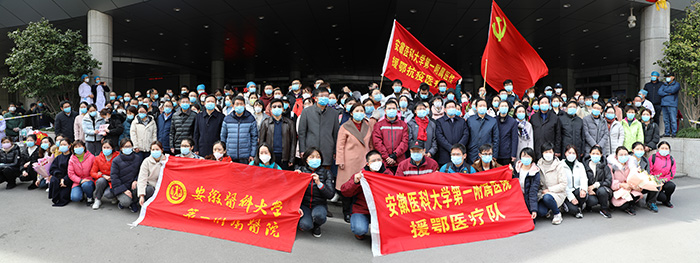 这是一张令人动情的照片。2020年2月13日,根据国家卫健委统一部署,我校第一附属医院连夜集结137名医护人员,组成医疗队驰援武汉,接管1个重症病区,负责全部患者的救治工作。接到命令后,顾家山书记和我紧急赶赴院区,为医疗队壮行。医疗队中,有刚动完手术回到工作岗位的呼吸与危重症医学科的徐爱晖主任,有毅然决定推迟婚期的年轻护士崔迪等。他们是我校许许多多抗疫基层一线工作者的缩影,他们舍小家顾大家,舍小爱成大爱,用生动故事谱写一曲白衣逆行者的赞歌!