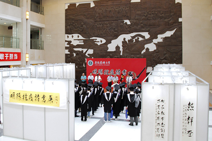 顾家山表示,此次展出以独特的视角,用诗书的语言再现了举国上下万众一心抗疫历程,歌颂了白衣天使医者仁心、救死扶伤的高贵品质,表达了对我校及全国各地支援湖北医疗队队员的敬意,是我校抗疫主题教育的生动一课。希望全校广大师生通过观看展出,在感受中国优秀传统文化独特魅力和深厚底蕴中提升个人文化素养,在回顾中国人民抗疫的伟大历程中进一步体会“中国力量”,不断提高思想境界,牢记“好学力行、造就良医”校训,秉持“弘毅担当、精医报国、康民济世”安医精神,为推进高水平医科大学建设凝聚起磅礴力量。
