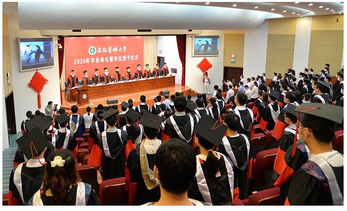 2676名本科生、1362名研究生、35名留学生,分别在毕业典礼现场或直播平台共同参加了毕业典礼。安医大还开发了“云合影”程序,未到场同学可以在线上进行毕业合影。典礼后,学校组织师生参观李明阳先生的“抗疫诗书展”。