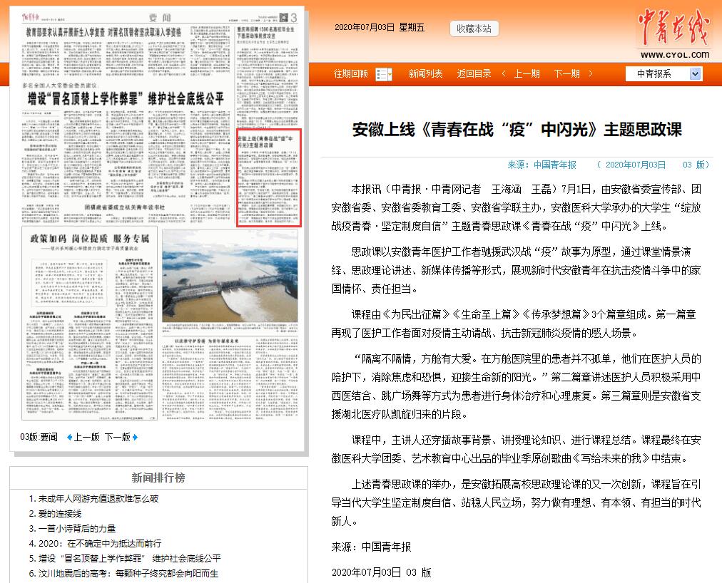 中国青年报:安徽上线《青春在战“疫”中闪光》主题思政课