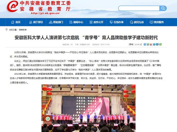 “我的中国梦”人人演讲活动开展以来广受赞誉。2014年,在教育部关工委发布高校关工委工作十大品牌优秀案例征集活动评选中,我校申报的《巧设载体,人人演讲中国梦》案例被评为“主题教育”品牌优秀案例。2018年,全国医药类高校共青团工作联盟年会上,我校应邀作《“我的中国梦”演讲 打造人人参与的思想引领品牌》的专题报告。2019年,省委主题教育小组简报中,专门介绍了该活动的开展情况和特色做法。此外,“我的中国梦”人人演讲还得到了省教育厅官网以及安徽日报、安徽青年报、新安晚报等多家省市级媒体的宣传报道。