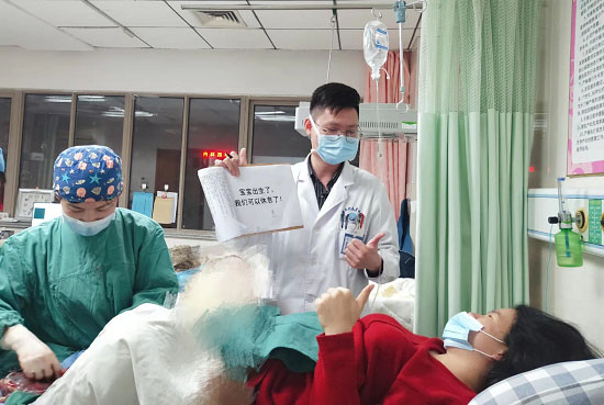 就这样,从上午8点一直到晚上7点半……分娩结束,医护人员一直用笔和纸与陈女士沟通,在其顺利产下一名男婴,值班医师张天赐写下了“宝宝出生了,我们可以休息了!”“宝宝真漂亮,很健康!”的卡片鼓励产妇,此刻,张医生与陈女士不约而同地竖起来了大拇指。安医大附属巢湖医院产科每年都抢救数例疑难及急危重孕产妇,承担着巢湖区域高危孕产妇的救治工作。