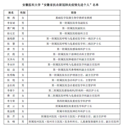 大会以“弘扬伟大抗疫精神,全面开启新阶段现代化美好安徽建设新征程”为主题,隆重表彰了抗击新冠肺炎疫情中,我省各地市、各单位所涌现出来的先进个人、先进集体、优秀共产党员、先进基层党组织。第一附属医院党委书记金宗祥作为全国抗击新冠肺炎疫情先进集体代表受邀出席表彰大会,并于主席台就座。学校公共卫生学院、第一附属医院、第二附属医院、附属巢湖医院、附属宿州医院等8个集体获得“安徽省抗击新冠肺炎疫情先进集体”荣誉称号,柳燕、李家斌、李燕午等来自学院及直属附属医院的21名教职医护人员获得“安徽省抗疫新冠肺炎疫情先进个人”荣誉称号。
