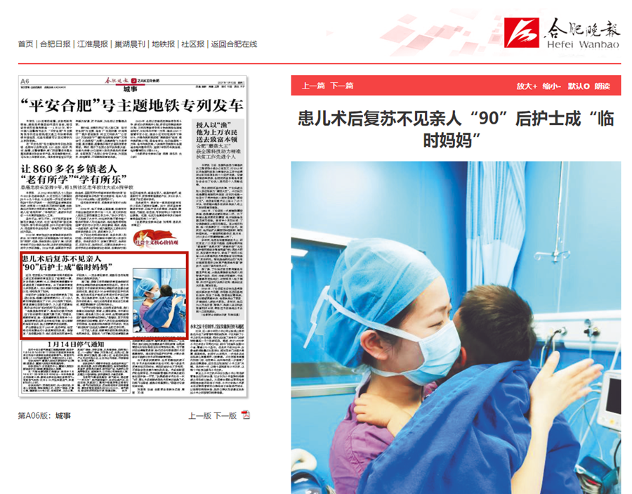 合肥晚报、江淮晨报、市场星报:患儿术后复苏不见亲人 “临时妈妈”拥抱唱歌安抚