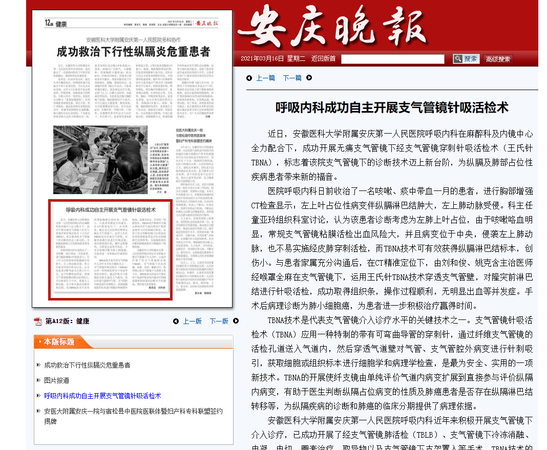 安庆晚班:呼吸内科成功自主开展支气管镜针吸活检术