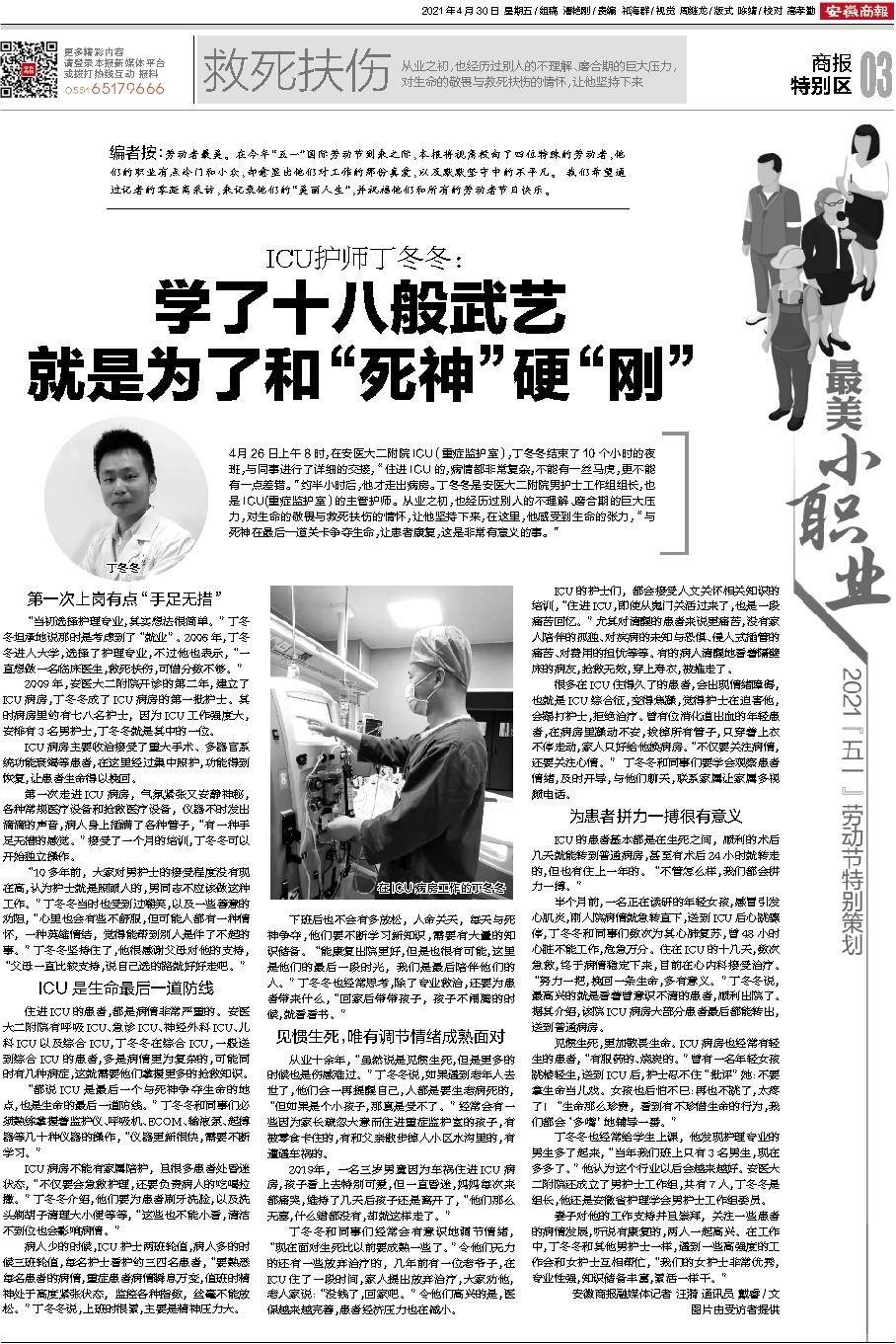 2009年,安医大二附院开诊的第二年,建立了ICU病房,丁冬冬成了ICU病房的第一批护士。其时病房里约有七八名护士,因为ICU工作强度大,安排有3名男护士,丁冬冬就是其中的一位。
