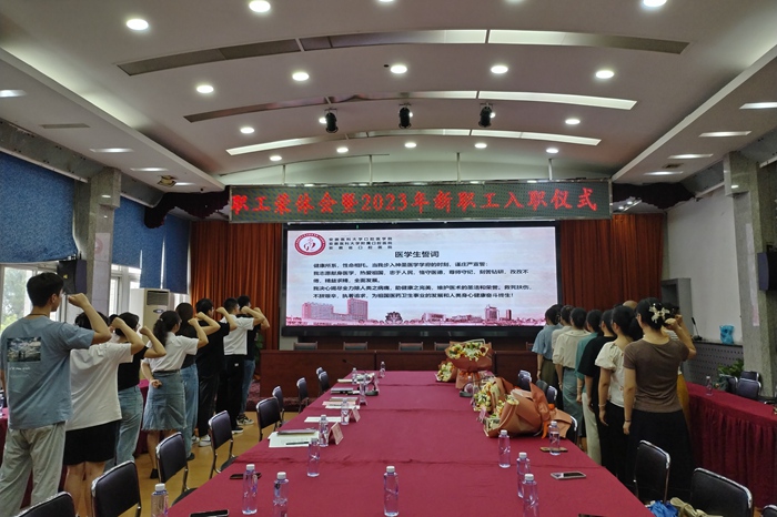 荣休职工代表蒋勇讲述了他工作期间为人民健康服务的感悟,并勉励新职工要以无私奉献的精神,全心全意为患者服务。在该院荣休职工王海林的带领下,全体新进职工肃然起敬,高举右拳,重温医学生誓词。吴乐平作为新进职工代表发言。