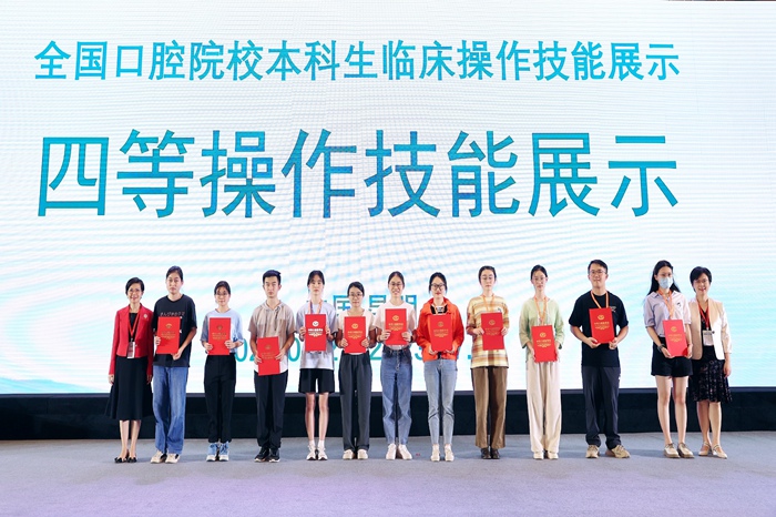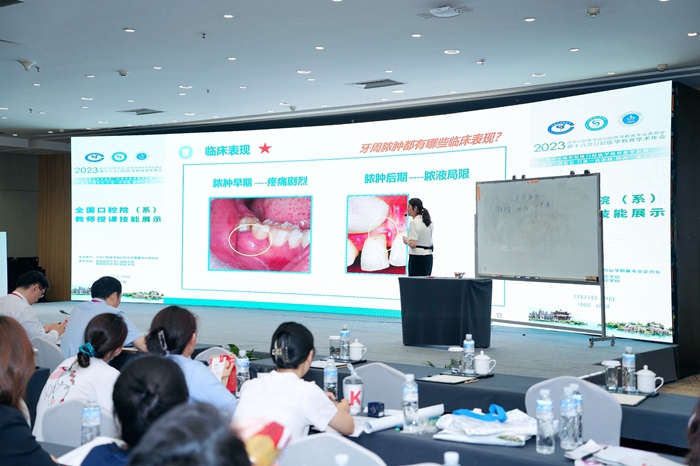 何家才受邀担任青年教师理论授课技能展示评委并进行精彩点评。该院牙周黏膜科教师杨洋代表学院参加青年教师授课技能展示。她利用线上线下相结合的混合式教学方法,通过师生互动、生生互动等多种形式,详细讲授了牙周脓肿的病因、临床表现、诊断与治疗,并巧妙地融入了思政教育元素,授课展示受到现场专家和学生一致好评,最终获得一等奖(第三)佳绩。该院种植科副教授周咏在“一流课程”论坛作题为《镜像操作训练在口腔临床前技能培训中的应用》交流报告,他从学生临床操作中对镜像操作不熟悉等临床技能训练难点入手,研发镜像操作训练装置,结合镜像操作训练,开发练习科目,并通过系列临床前技能训练内容,对教学效果进行分析和反思,展示了临床前技能训练课程创新性和挑战度。该院2019级本科生储梦萍参加了临床操作技能展示,最终以出色的发挥获得四等奖。