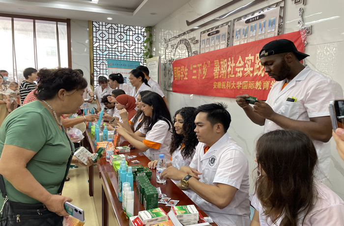 送医送药下乡,关爱居民健康。随后,实践团来到亳州市薛阁社区卫生服务中心开展“送医送药下乡”活动,为当地居民送去一些消暑降温药品以及日常生活药品。实践团成员一边发药一边为当地居民介绍药品使用方法以及夏季防暑小妙招,得到社区居民的由衷感谢。此次活动让国际学生们了解了中成药已经与人们的日常生活密不可分,坚定了学习并传播中医药的决心。