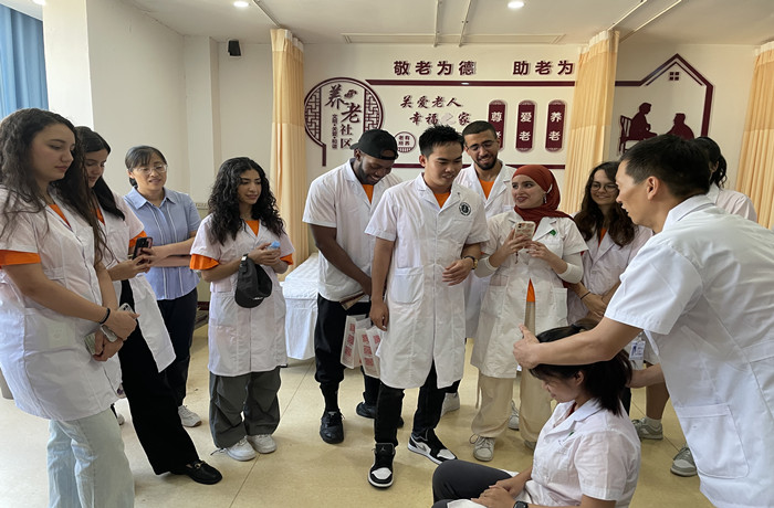 领略东方医技,传承医者仁心。实践团第一站前往亳州市人民医院骨科康复门诊进行传统中医理疗学习,在这里,实践团成员们了解了中医的治疗理念,观看老中医为肩周炎、失眠、椎间盘突出等常见病患者进行针灸、拔罐等古法治疗。为了加深对中医传统医技的理解,国际学生们还亲身体验了中医针灸和正骨推拿。来自摩洛哥的2018级MBBS专业留学生YAHYA NAJEH表示,“之前对中医文化只是初步了解,没想到做完推拿感觉身体舒服多了,现在神清气爽的!真的很神奇,我马上就要毕业了,回国后我要积极传播中医文化,让它惠及全世界。”