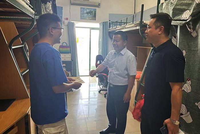 情系学子,人文关怀。骆广东、孟晓明一行深入学生宿舍、实验室等地,与学子亲切交流,实地了解学生学习生活现状,掌握学生实际困难和需求,温馨提示学生留校期间要注意人身及宿舍安全、注意提高防范意识、注意防暑降温。受访学生对学院的关心爱护表示感谢和感动,并向学院反馈了自己暑假期间的学习规划、科研进度、社会实践等情况,表示留校期间一定会注意各方面的安全,严守学校的规章制度,合理制定学习目标,树立信心,积极进取,努力成长成才。该院始终坚持将学生需求置于首位,为暑期留校学子创造安全、稳定、舒适的学习生活环境。