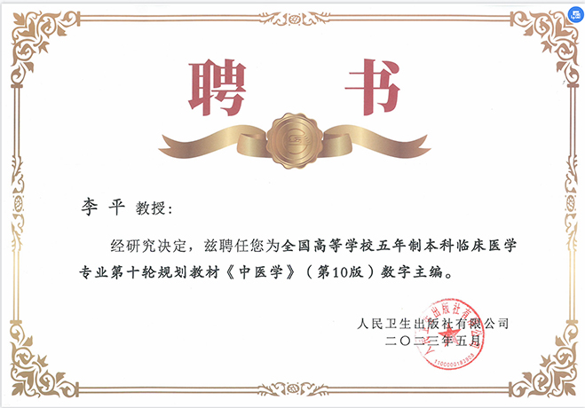 近日,我校第一附属医院李平教授当选为全国高等学校五年制本科临床医学专业第十轮规划教材《中医学》(第10版)数字主编。