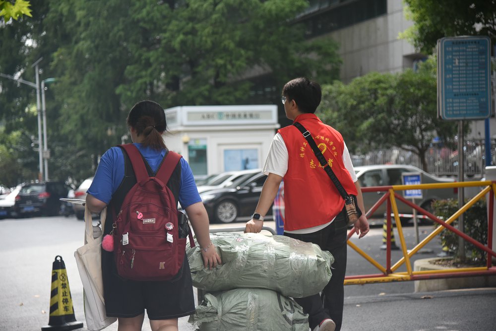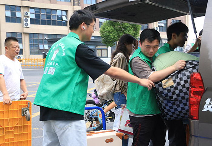 在研究生新生开学前,为做好既有“力度”又有“温度”的报到工作,学校通过发放“开学第一餐”补助,开辟新生缴费绿色通道、家庭困难研究生新生前置帮扶等多项暖心举措,让研究生新生切实感受到来自学校的温暖。为进一步消除交通安全隐患,联合属地公安交通部门,在迎新当日共同维护校园安全秩序。此外,学校联系银行入校协助学生办理银行卡激活等业务,并已通过人像核验系统完成2023级研究生新生人像比对和照片信息采集等工作。迎新现场,身着各色小马甲的志愿者在各个迎新地点间不断穿梭,从校门到宿舍楼,从宿舍楼到报到处,志愿者顶着炎炎烈日,拖着小推车不辞辛劳地为新生搬运着行李,导引着流程与方向。