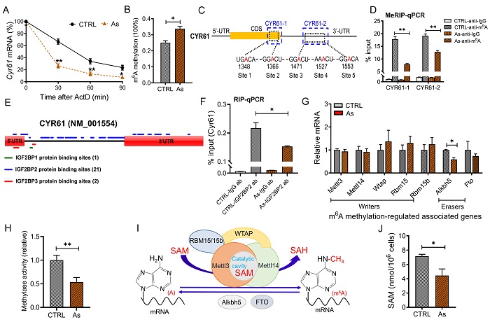 该项研究表明,孕期砷暴露通过抑制胎盘滋养层细胞侵袭诱发胎儿生长受限,富含半胱氨酸血管生成诱导因子61(Cyr61)m6A修饰下调参与砷暴露抑制胎盘滋养层细胞侵袭;S-腺苷蛋氨酸耗竭介导m6A甲基转移酶活性降低参与砷暴露下调胎盘滋养层细胞Cyr61 m6A修饰;叶酸补充缓解孕期砷暴露导致胎盘滋养细胞侵袭抑制和胎鼠宫内生长受限;通过病例-对照研究证实,孕早期孕妇尿砷浓度和血浆CYR61水平之间呈负相关。该项研究将为筛选孕期砷暴露诱发FGR的表观遗传生物效应标志提供实验资料,也为评估孕期砷暴露对育龄妇女生殖健康损害作用并制定有效预防对策提供新线索。