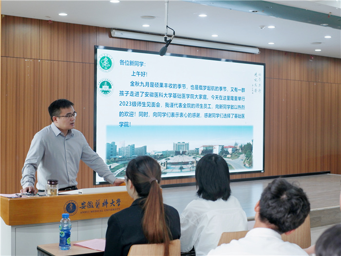张智代表学校以及基础医学院的师生员工,向新同学表达了热烈的欢迎。他以学院的发展历史、办学优势、人才培养为切入点,详细介绍了基础医学院优秀的教师队伍、优质的教学资源、先进的科研平台、高水平的科研团队、浓厚的学术氛围、多彩的实践活动及广阔的国际视野,让新生对学院的历史底蕴和现状有了更加深刻的认识。他希望同学们秉承“好学力行,造就良医”的校训精神,践行安医精神,为推动国家卫生健康事业发展和人民健康奋斗终身。