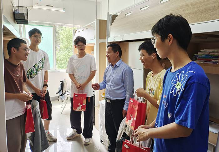 该院院领导带领各年级辅导员深入学生寝室,倾听学子心声,并为学子送上订制慰问品。该院党委书记骆广东向同学们表达节日的问候,并亲切关怀在寝学生。他叮嘱同学们在喜迎中秋国庆的同时,应当提高安全责任意识,维护人身财产安全。他希望同学们作为新时代的见证者与创造者,要立足当下、志存高远,树立榜样意识,将自身发展与社会发展紧密结合,为成长为高水平复合型人才不断奋进。同学们纷纷对学院的关心表以感谢,并表示会牢记嘱托,脚踏实地,艰苦奋斗。