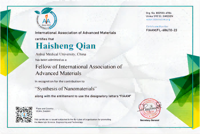 国际先进材料学会是全球先进材料领域的权威学术组织,聚集了世界范围内材料科学与技术领域优秀科学家,致力于为先进材料科学、工程和技术在世界范围内的快速发展提供平台。国际先进材料学会会士是国际先进材料学会授予研究人员和科学家的一项荣誉,授予在材料科学、工程和技术领域进行了独创且开展重要研究的科研人员或科学家。为表彰其在生物材料领域所做出的杰出贡献,学会授予其“国际先进材料学会会士荣誉称号。大会上,钱海生受邀在线作了题为《无机纳米结构可控合成的生物医学应用(Controllable synthesis of inorganic nanostructures for biomedical application)》的报告。