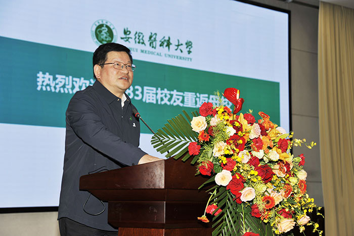 顾家山代表学校,向重返母校的各位校友表示热烈的欢迎和诚挚的问候,对校友们长期以来给予学校建设与发展的关心与支持表示感谢。结合一张张照片,顾家山带领校友们重温了大家在安医的时光。他表示,1983届校友的求学时光,是一个时代的记忆和符号。校友们处在时代的波澜壮阔处,人生的历程与国家发展的曲线高度吻合,一直向上向前。40年来,校友们见证、参与了国家的改革开放,更是卫生健康事业发展的实践者、推动者,为母校乃至全社会都作出了重要贡献。大家在各自领域谱写精彩人生篇章,扛起了属于安医人的时代责任,取得令母校骄傲、让全体师生自豪的成就,也涌现出了一大批杰出校友,是后辈们学习的榜样。