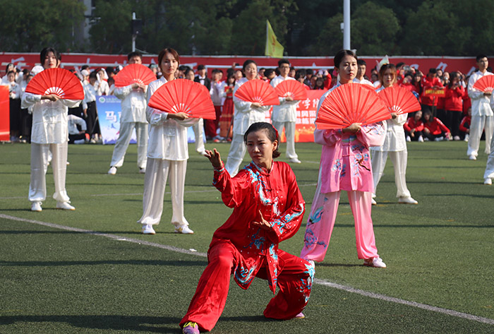 由武术世界冠军、我校教师王雪带领校太极拳教学训练团、校武术队联袂出演的《太极功夫扇》令人眼前一亮。同学们在挥扇合扇间将武术与太极相结合,气势磅礴却又行云流水,展现出中华优秀传统文化的独特魅力,让现场观众近距离感受太极的气韵之美。