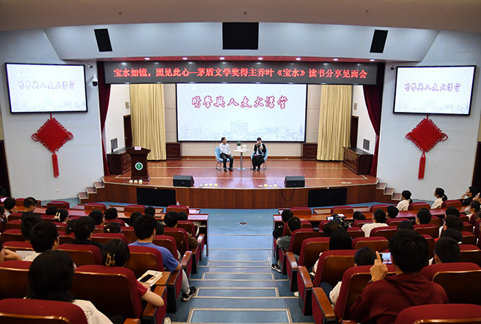 访谈分享会上,乔叶结合自己的成长和生活经历,同与会师生分享了《宝水》的创作故事,将该书的创作契机、创作过程和写作思路等娓娓道来,表达了她对故乡细腻又深厚的情感。她通过分享一个个自己在乡村体验生活的鲜活片段,带领师生们走进宝水村,深入感受这个小村落在新时代背景下丰富而深刻的嬗变,进一步了解了我国现代化乡村建设的新图景。互动环节,乔叶耐心详细地回答了同学们的提问,就如何进行文学创作等答疑解惑。她认为,文学是“人学”,文学动人的地方在于其展现的文字有一种充沛的情感力量,这也是文学的根本力量。此外,写作是从“小我”走向“大我”的一个印证,“一口小井只有打得足够深,才能通向更广阔的地下河”。