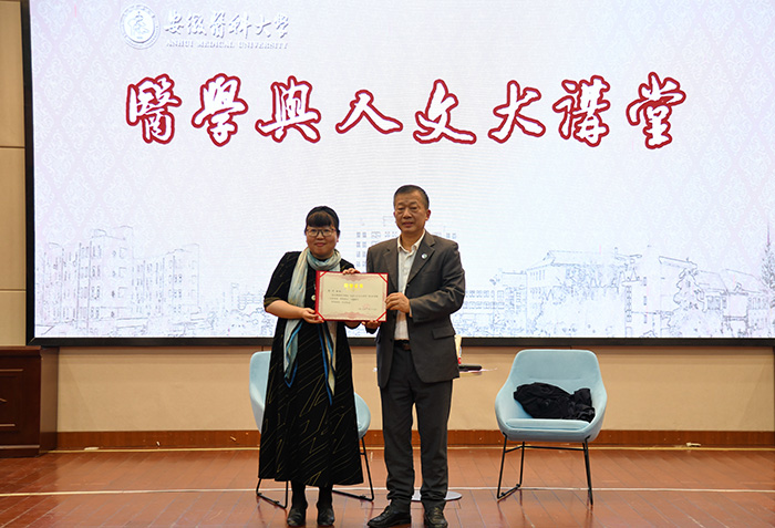 10月27日下午,北京老舍文学院专业作家、北京作协副主席乔叶做客我校医学与人文大讲堂,与师生们分享其第十一届茅盾文学奖获奖长篇小说《宝水》的有关内容。安徽省作协副主席、合肥市作协主席洪放对乔叶进行访谈。校党委常委、副校长肖圣龙出席活动,并为乔叶颁发“医学与人文大讲堂”纪念证书。