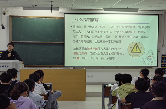 省疾控中心卫生应急与急性传染病防治科副科长肖永康受邀担任主讲。他从传染病概述、学校传染病防治的重大意义、传染病的流行过程以及人类与传染病斗争取得的一些伟大成就等几个方面,就传染病的基本知识作了全面介绍,并以霍乱、肺结核、猴痘和艾滋病等传染病为例,详细讲解了疫情形势、流行病学现状、传播途径以及预防措施等内容。他倡导学生养成良好的生活习惯,做自己健康的第一责任人。风趣幽默的讲课方式得到现场同学的一致好评,大家表示对传染病相关知识有了更系统、更科学的认识,今后会保持健康的生活方式,不断提高防病意识。