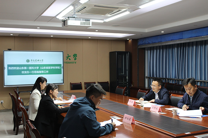 11月7日下午,山东第一医科大学(山东省医学科学院)党委办公室(校院长办公室、法律事务办公室)副主任刘伟一行来我校调研交流校友工作。校党政办(校友办)主任、校友会秘书长李震静,校友办副主任汪娟与来访客人座谈交流。