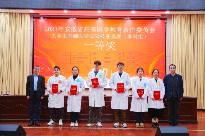 大赛决赛内容为虚拟仿真实验(动物实验及ESP)、组织切片及微生物染色与观察、线下机能学实验操作。虚拟仿真实验由考试系统自动评价,实验操作由来自上海交通大学、南京医科大学、中山大学等第三方高校评委专家进行现场评审,最终根据三部分的成绩综合评定。经过激烈角逐,安医大2队、4队,安医大临床学院3队,皖医1队、2队、4队6支队伍分别获得一等奖,吕雄文等出席领导为获奖队伍颁奖。温州医科大学龚永生教授在闭幕式上就选手竞赛情况进行了点评。