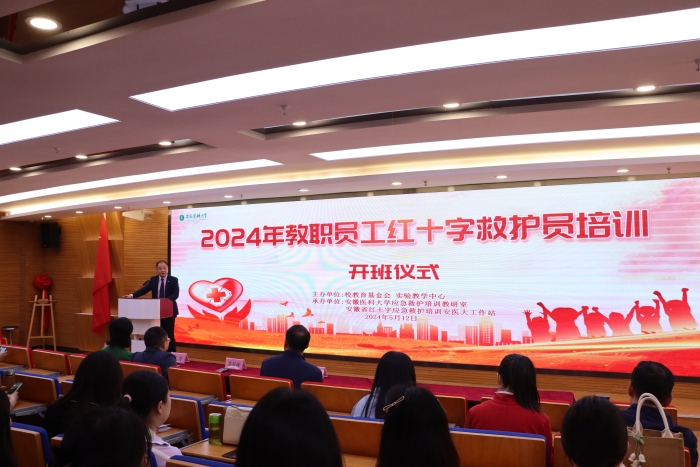 5月12日,我校2024年教职员工红十字救护员培训班开班仪式在力行楼四楼报告厅举行。校人事处处长高跃峰、教育基金会秘书长袁方出席活动,实验教学中心主任沈涛致辞,近60名教职员工参加培训。