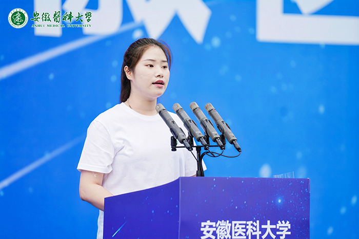 学校“十佳基础教师”荣誉称号获得者、基础医学院范一菲作为教师代表发言,鼓励毕业生们坚持锻炼、坚持理想,保持对医学的热爱和执着,用强健的身体、坚定的信念迎接工作和生活的种种挑战。来自药学院的缪钰、第一临床医学院(第一附属医院)的周鲁平、国际教育学院的吴欣玲,分别作为本科生、研究生、来华留学生代表发言。