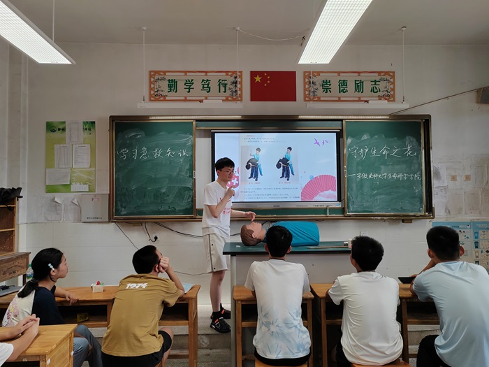 在当地镇村的帮助下,实践团第一时间为许村的孩子们进行作业辅导。队员们发挥学科优势,耐心细致地解答每一个问题,帮助孩子们巩固课堂知识,订正暑期作业。在夏日健康小课堂上,团队成员还用通俗易懂的语言,为孩子们讲解了常见疾病感染与预防等知识,引导他们自觉养成良好的生活作息习惯。许村中学,实践团开展应急救护知识培训,帮助孩子掌握实用的生存技能,也将“关爱他人、勇于担当”的社会责任感教育在孩子中传递。