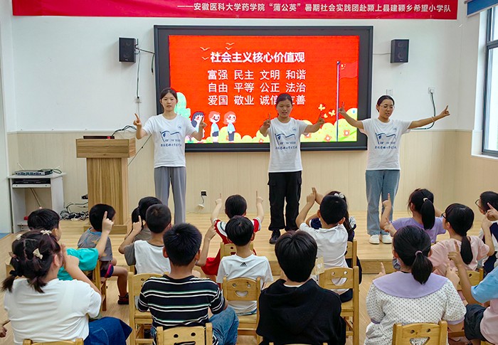 7月11日至18日,药学院“蒲公英”暑期社会实践团组建两支队伍,前往阜阳颍上县八里河镇建颍乡开展普通话推广活动,助力乡村振兴。