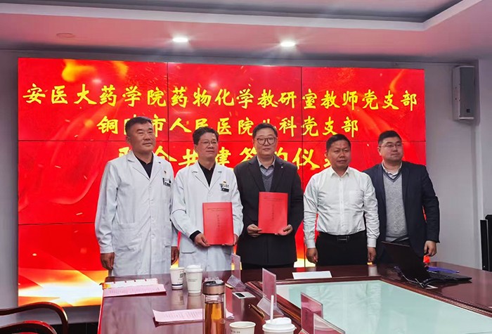 学院师生先后参观了铜陵市人民医院肿瘤防治研究所(博士后科研工作站)、门诊部、药学部、医院院史馆和党建教育馆,药学院党委委员、院长助理刘明明在座谈时介绍了学院历史沿革、教学科研、学科建设、人才培养等情况。学院药物化学教研室教师党支部、铜陵市人民医院儿科党支部负责人共同签署了支部共建合作协议。双方还就人才双聘、科技成果转化、科研项目联合申报、人才培养、毕业生就业等进行了深入交流。