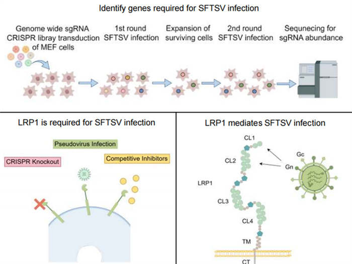 此项研究借助CRISPR高通量筛选技术,发现低密度脂蛋白受体相关蛋白1(LRP1)是SFTSV的进入因子。通过体内和体外实验证明了LRP1在SFTSV感染中的重要性及其在病毒侵入中的作用。机制研究表明,SFTSV通过糖蛋白Gn结合宿主细胞LRP1的胞外端Cluster I(CLI)和ClusterⅡ(CLII)结构域。使用LRP1中和抗体及相应的抑制剂可以有效阻断SFTSV感染。小鼠实验结果显示,靶向LRP1可以显著挽救SFTSV感染导致的小鼠死亡。研究为临床制定SFTS治疗策略提供了新靶点和理论依据。