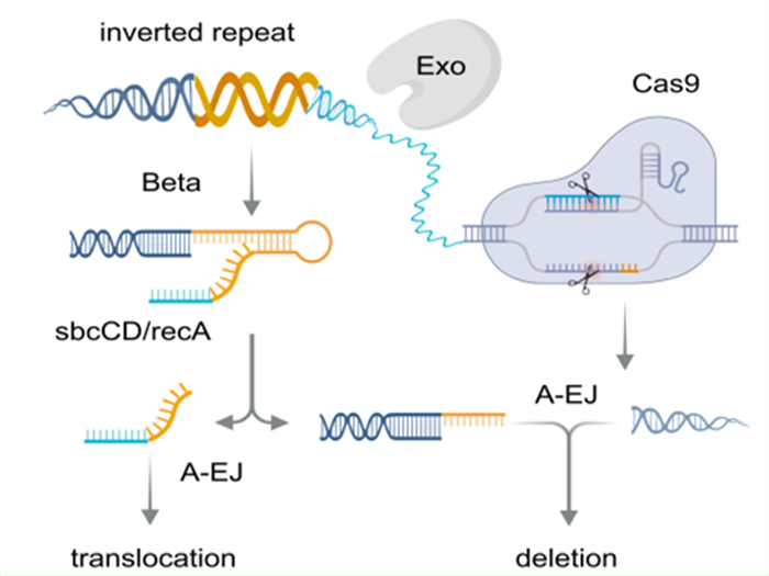 该论文在前期发现重离子辐射可以强制激活替代末端连接alt-EJ通路,进而导致染色体易位重排的发生的基础上,进一步探究基因组广泛存在的非B non-B序列在染色体畸变中的角色,通过利用规律间隔的短回文重复CRISPR基因编辑技术在反向重复元件附近模拟重离子诱导DNA双链断裂DSB,发现non-B元件协同DSB激活了单链退火/替代末端连接SSA/alt-EJ联合修复通路,进而导致易位重排的发生。