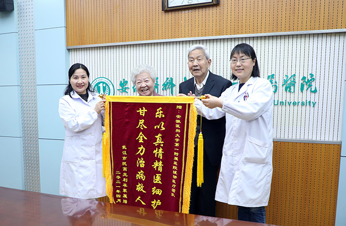 她是张泓,中共党员,博士研究生,急诊医学科主任医师,教授,现任我校第一附属医院高新院区副院长。作为医生,从业三十四年来,她坚守在急危重症救治第一线,以过硬的业务能力、宽厚的医者仁心,挽救了无数患者的生命。新冠肺炎疫情发生后,积极响应号召,主动请缨,带领安徽支援湖北第四批(安医大一附院)医疗队奔赴武汉,整建制接管的华中科技大学同济医学院附属协和肿瘤中心Z11重症病区,让党旗在抗疫一线高高飘扬,圆满完成党和国家交给的任务,是患者心中的好大夫,同行眼中的好医生。4月22日,曾在湖北武汉的病房中得到张泓和她同事们精心照顾、从新冠肺炎中康复的84岁高爷爷和77岁龙奶奶夫妻俩,带着当初的约定,不远千里来到安徽合肥,在时隔405天之后与曾经朝夕相处的援鄂队员们重逢,并送上锦旗以表达内心深深的感激之情。