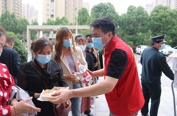 当日天气炎热,中午时分仍有三百余名群众顾不上就餐排队等候接种,了解这一情况后,该院领导高度重视,立即组织医院办公室、团委、总务部等相关部门工作人员赶至现场,联系超市购置饮用水、面包等食品。志愿者向所有排队等候、接种后留观的群众及加班加点进行接种工作的医护职工发放“暖心食品”。